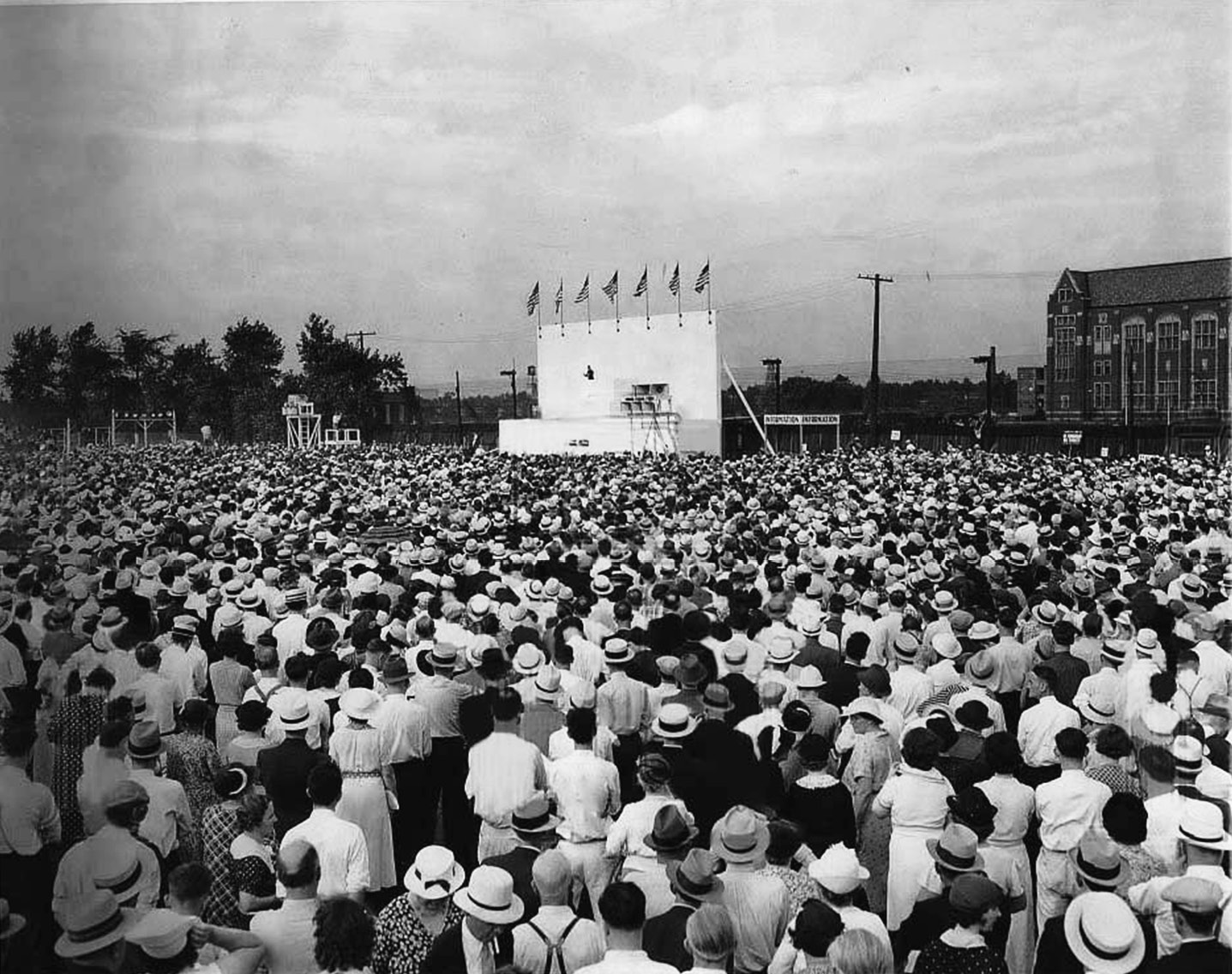 Beyond the impressive crowd size, however, at least as compared with the political pageants staged by the Nazis, Johnson’s designed tableau ended up a little wan. For one thing, Hitler’s rally makers made sure to keep a tight hold on all background elements. Zeppelin Field in Nuremberg, for instance, was ringed by forest, and the stadium in the city was a closed set. By contrast, in Chicago, there was no way to hide the periphery of Riverview Park. The rally grounds themselves were usually reserved for a golfers’ driving range and midget auto races, and so—all too visible beyond Johnson’s massive Keck-built platform—dark netting was strung twenty feet high to keep errant tee shots from bouncing onto nearby streets. Also visible were telephone wires strung from pole to pole, and a few unprepossessing water tanks and smokestacks. In the immediate foreground stood a tall brick workaday building, an auditorium that looked like a site for high school basketball games and school plays.