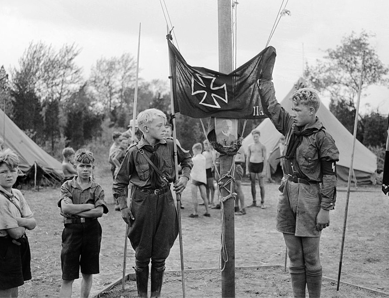 The banners the boys flew and the insignia they wore were not entirely uniform. They always included the swastika, but there was also room for local flair, Metcalfe noted, pointing out one Hitler Youth flag sporting a skull in the middle.