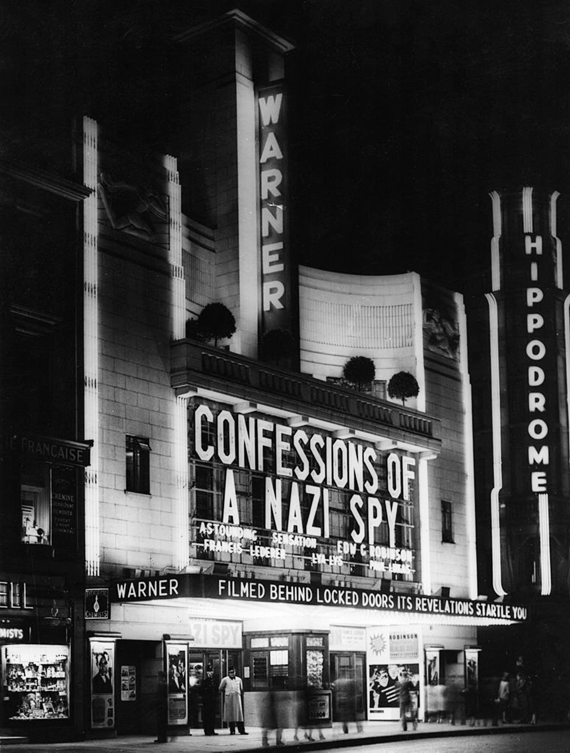 After the sniper-protected Hollywood premiere, Confessions of a Nazi Spy had a monthlong rolling open across the country. The impact was proof of the power of Hollywood. More than news coverage, more than law enforcement investigations, more than congressional hearings, the film industry could have a huge  effect on public awareness. “It marked the moment when millions of moviegoers began to realize the full enormity of what was happening in Europe and what that might mean for the United States,” Rhodri Jeffreys-Jones writes in The Nazi Spy Ring in America, his 2020 book about the espionage case on which the movie was based.