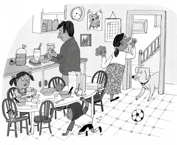 But Hugo quickly realized how wrong he was. The kitchen that morning was pure madness. Mom and Dad were running around wildly in their nice work clothes, barking at the kids and at each other. Zoe had accidentally spilled milk all over the table and was trying to push it back into the glass. Sofia was frantically running around looking for her backpack. Mom was shouting up the stairs to make sure Enrique was awake, while Dad was finishing packing everyone’s lunches. Hugo took a deep breath and quickly got to work making everyone’s lives easier.