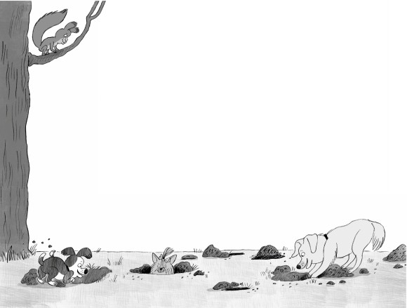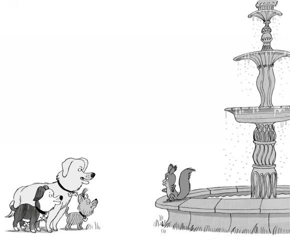 All three dogs were sprinting as fast as they could as the sprightly squirrel dashed through bushes, under benches, and into the dog run, trying his best to lose them. Nuts was fast, but a bit out of practice, and King, Lulu, and Hugo managed to catch up with him at every turn.