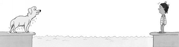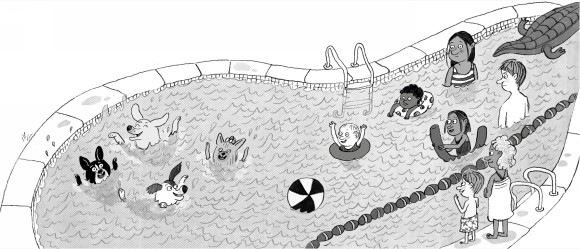 That’s nice! Hugo thought. We’re making them laugh! Normally Hugo wouldn’t have just jumped into a pool full of people he didn’t know, but he was starting to think that sometimes, maybe, acting wild and spontaneous could pay off. After all, those teens in the bakery had loved it when he’d run around and jumped up onto the chairs. Maybe humans like it when I give in to my doggiest instincts . . .