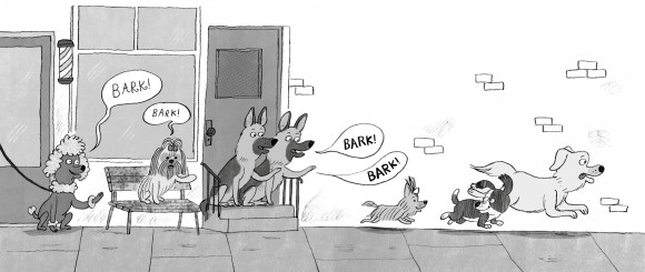 “You finally used your little brain and figured it out,” said Pickle, cruel as ever. “After you savagely trapped me outside my yard, I wandered downtown, where I attracted lots of attention by attacking a balloon outside a delicious-smelling bakery. Soon, I was surrounded by admirers. Unfortunately, two of those admirers turned out to be animal control officers, who shoved me into a cage in a van and brought me here. Those dogs at animal control put me in here with a bunch of dogs. They’re a bunch of bathtubs, if you ask me.”