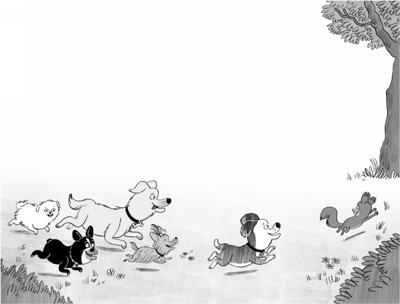 Napoleon dropped the stick he was chewing on, and Waffles stopped barking at her shadow. They quickly joined Hugo, Lulu, and King in their high-speed pursuit of the nimble squirrel.