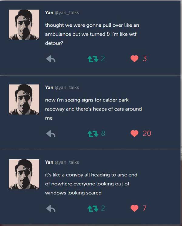 ‘All my feeds are full of it, it’s horrible. Hundreds of people smashed into each other, into the railing or run off the freeway. I thought -.’