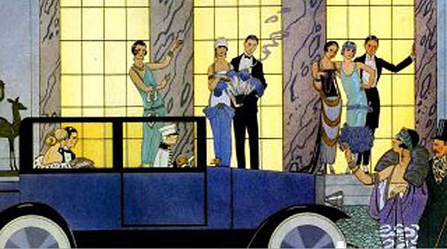 Joel could not get to the dinner. Self-conscious in his silk hat against the unemployment, he waited for the others in front of the Hollywood Theatre and watched the evening parade: obscure replicas of bright, particular picture stars, spavined men in polo coats, a stomping dervish with the beard and staff of an apostle, a pair of chic Filipinos in collegiate clothes, reminder that this corner of the Republic opened to the seven seas, a long fantastic carnival of young shouts which proved to be a fraternity initiation. The line split to pass two smart limousines that stopped at the curb.